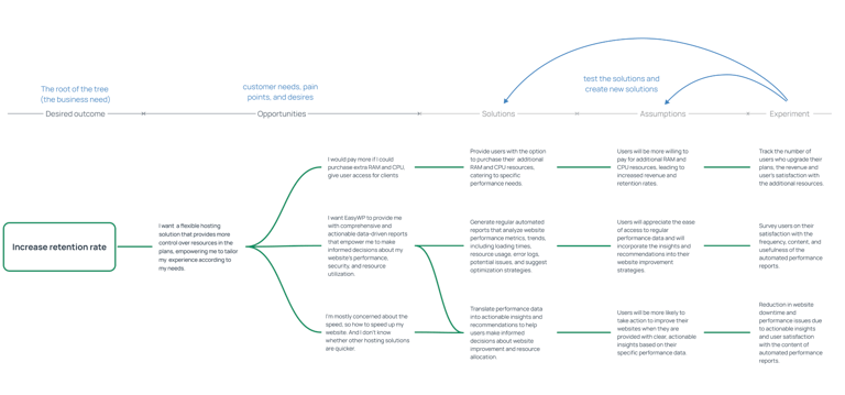 Created an Opportunity Tree (inspired by Continuous Product Discovery book), connecting business outcomes with user needs, opportunities, and solution hypotheses
